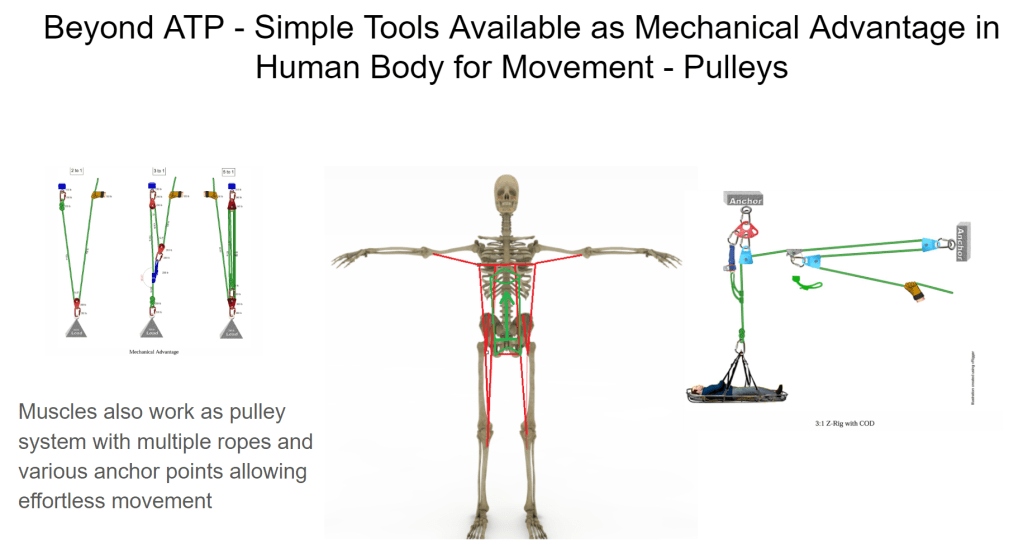 In addition to generating energy via ATP, our muscle fibers also work as ropes similar to the pulley system applied in physics. Those principles commonly used in rigging and rescue, are directly applicable in our body, especially at the knee and ankle joint.