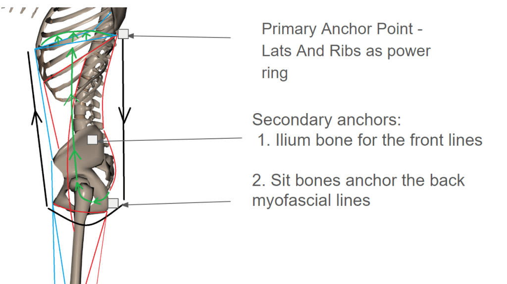 By definition, an anchor point is a point of support, used to secure or stabilise another object or structure. Understanding the forces acting on the anchor is crucial for ensuring the stability and safety of any structure that is supported by it. It can also help to prevent damage or failure of the anchor point itself. Lat / Serratus and Ext Oblique Power Ring (5-7th rib) is the primary anchor point in human body. The lats/glute max line work as a lever and movable anchor. From mechanical point of view, glutes and iliacus utilise ilium bone and sit bones as secondary anchors respectively, stabilising the pivot point only.