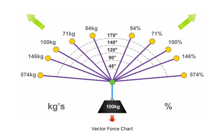 Below Vector Force Chart displays the forces applied to each anchor point when the load is equally shared. In physics, internal angle of less than 45 degrees is the most efficient. The angles need to be maintained accordingly to mitigate excessive load on applicable anchor points (hip and shoulders)